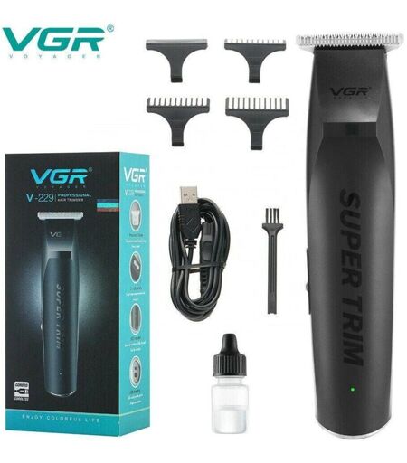 TRIMMER VGR V- 229Caratteristiche: Area del corpo: Schiena, petto, viso Tipo di motore: Rotante Fonte di potere: ElettricoGenere: Kit per il taglio dei capelliTipo di testa: T-Blade All-in-oneCordlessDoppia tensioneIndicatore di batteria scaricaImpugnatura antiscivoloTempo di ricarica rapidoRicaricabileDimensioni da viaggioVolt nominali AC220-240V 50-60HzMateriale della lama: Lama di precisione in acciaio con copertura in titanioAccessori Con taglia capelli / pettini guida / spazzola / olio / forbici / pettineBatteria di ricarica ad alta efficienza all'internoTempo di carica 1,5 ore di ricarica completaDesign Lama in acciaio lunghezza di taglio variabile lama facile da smontare, metterla sulla presa di ricarica dopo l'uso, la spia si accenderà ...