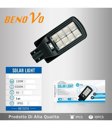 Lampione stradale ad energia solare con corpo unico è costituito da tutti i componenti necessari al funzionamento in autonomia del lampione led, grazie all'elettronica interna esso garantisce a batteria completamente carica circa 12 ore di illuminazione continua anche in assenza di sole. Il pannello fotovoltaico del lampione ha una potenza pari a 120W, esso permette di ricaricare la batteria interna, e di alimentare i Led. L'installazione è semplice e rapida, basta infatti, fissare il lampione fotovoltaico in un palo o a muro, attivare lo stesso tramite l'interruttore, il lampione lavorerà autonomamente. L'Armatura Stradale è dotata di telecomando IR che ci consentirà di scegliere la modalità di funzionamento Caratteristiche tecniche: 120W Materiale: Alluminio e abs Led: 176 Potenza: 120 W Colore luce: 6500 K (bianca fredda) Pannello solare INTEGRATO Batteria interna ricaricabile tramite pannello solare Sensore crepuscolare per accensione automatica Sensore di movimento Luce ...
