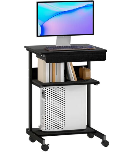 Scrivania Scrivania Moderna Salvaspazio 56x51x79 cm con Cassetto Scorrevole e Ruote in Legno Ingegnerizzato e Metallo Nero La nostra scrivania pc rivoluziona la tua area lavoro con una soluzione innovativa, grazie alle sue ruote girevoli e quelle anteriori bloccabili per offrirti maggiore stabilità. Un ampio cassetto e dei ripiani su 2 livelli permettono di mantenere tutto in ordine, mentre il piano d'appoggio in legno e la struttura in metallo regalano un'eleganza contemporanea. CASSETTI E SCAFFALI: Questo elegante modello di scrivania in legno include un piano d'appoggio per pc o monitor fino a 18", un comodo cassetto scorrevole per la cancelleria, uno scaffale di mezzo per i libri e un ripiano inferiore utilizzabile come supporto per la CPU o per contenere scatole FACILE DA SPOSTARE E BLOCCARE: La nostra scrivania pc è dotata di 4 rotelle girevoli per poterla spostare agilmente da una stanza all'altra. 2 di queste rotelle sono bloccabili per assicurare stabilità durante l'uso ...