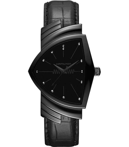 Orologio Solo Tempo Da Uomo Di Hamilton Della Collezione Ventura. Orologio Con Cassa In Acciaio Con Finitura In Pvd Nero Della Dimensione Di 32. 30 Mm X 50. 30 Mm, Altezza Di 9. 27 Mm E Quadrante Di Colore Nero. Cinturino In Pelle Di Vacca Di Colore Nero ...