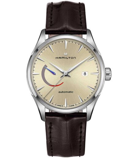 Orologio Meccanico Da Uomo Di Hamilton Della Collezione Jazzmaster, Modello: Power Reserve. Orologio Con Cassa In Acciaio Del Diametro Di 42 Mm, Altezza Di 12. 64 Mm E Quadrante Di Colore Beige. Cinturino In Pelle Di Vitello Di Colore Marrone Con ...