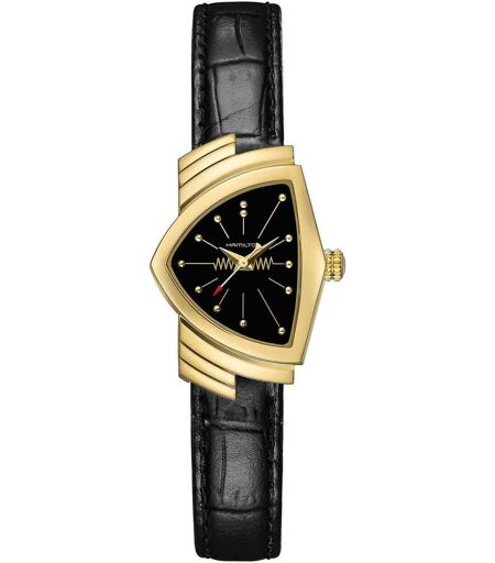 Orologio Solo Tempo Da Donna Di Hamilton Della Collezione Ventura. Orologio Con Cassa In Acciaio Con Finitura In Pvd Giallo Della Dimensione Di 24 Mm X 36. 50 Mm, Altezza Di 7. 82 Mm E Quadrante Di Colore Nero. Cinturino In Pelle Di Vacca Di Colore Nero ...