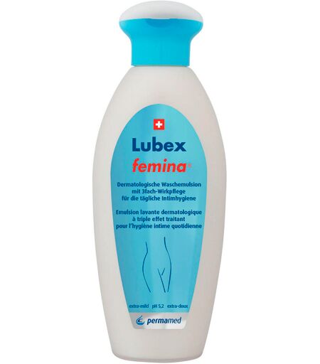 Lubex femina è un'emulsione lavante dermatologica a tripla azione per l'igiene intima quotidiana. Lubex femina deterge con estrema delicatezza e previene le irritazioni durante l'uso prolungato. Lubex femina ha un effetto duraturo contro gli odori corporei e garantisce una sensazione di piacevole freschezza del corpo. Applicazione: Lubex femina si usa come un sapone liquido. Usare solo esternamente. Dopo il risciacquo, tamponare senza strofinare. Può essere utilizzato anche per la cura di tutto il corpo. In caso di contatto con gli occhi, sciacquare abbondantemente con acqua tiepida. ...