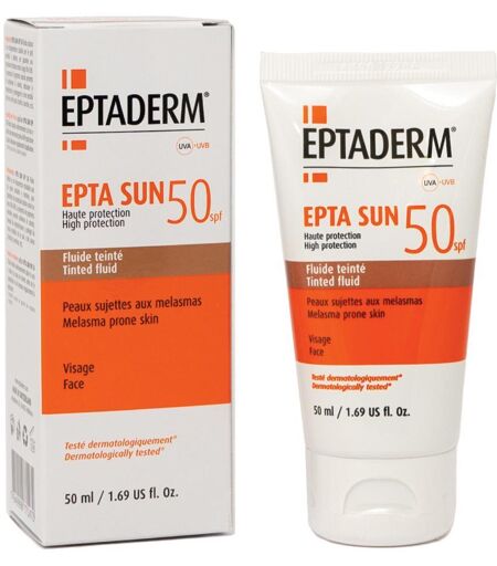 EPTADERM - EPTA SUN 50spf Alta protezione Fluido colorato - Descrizione Fotoprotettore studiato per le pelli sensibili e reattive, per garantire una protezione ottimale contro i raggi UVA/UVB. La presenza di pigmenti naturali permette di uniformare il colorito, attenuare le imperfezioni e protegger… ...