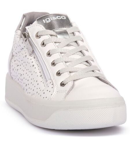 sneakers confort per donna realizzate in pelle traforata bianco con elementi in pelle argento. chiusura con lacci e zip laterale. fodera in tessuto sottopiede estraibile in pelle fondo in gomma bianco con zeppa 4cm. made in italy. colore: bianco. ...