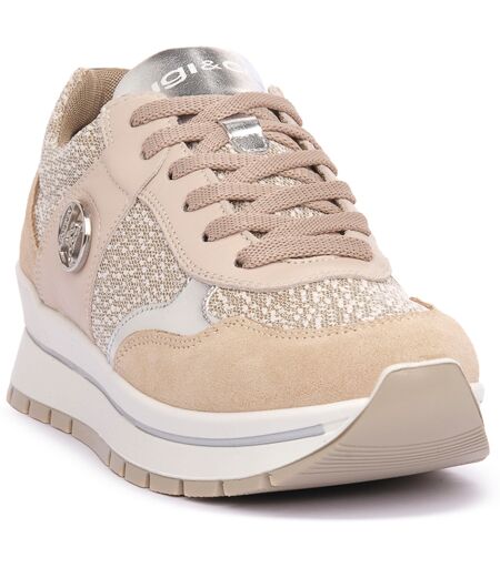 sneakers igi&co; per donna realizzate in pelle e tessuto chiusura a lacci. fodera in tessuto sottopiede estraibile in pelle fondo in gomma bianco con zeppa 4 cm. made in italy. colore: beige. ...