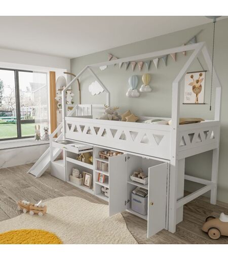 HAUSS SPOLE Lettino a soppalco per bambini 90x200cm, letto singolo con scivolo, cassetti, caselle, molteplici ripostigli, legno, bianco, senza materasso