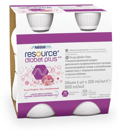 RESOURCE DIABET PLUS FRAGOLA - Descrizione Resource® Diabet Plus è un alimento a fini medici speciali, nutrizionalmente completo, ad elevata concentrazione calorica e proteica e a basso indice glicemico (IG: 30), per la nutrizione orale di pazienti diabetici o con alterazioni del metabolismo dei ca… ...