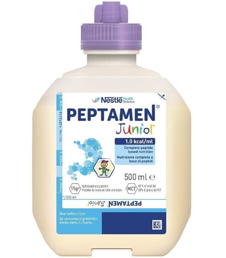 Si prega di condurre una dieta variegata ed equilibrata e uno stile di vita sano. Peptamen® Junior è un alimento a fini medici speciali a base di 100% sieroproteine di latte, ricco di MCT (trigliceridi a catena media), per la nutrizione enterale di bambini da 1 a 10 anni. È facilmente digeribile ed assorbibile, alimento semielementare nutrizionalmente completo, bilanciato, isoproteico e isocalorico. Peptamen® Junior è naturalmente ricco di glutammina e di cisteina. Assunzione consigliata: Da somministrare sempre secondo indicazione medica. Come unica fonte alimentare: 2 - 4 flaconi / die (1.000-2.000 kcal/die) Come integratore della dieta: 1 - 2 flaconi / die (500 - 1.000 kcal/die) secondo le necessità nutrizionali del paziente. La somministrazione deve essere graduale fino a raggiungere la dose prescritta. Per garantire la somministrazione di quantità costanti di Peptamen® Junior, si consiglia di utilizzare una pompa peristaltica. La buona tollerabilità permette di attuare una opportuna nutrizione enterale precoce e di raggiungere in tempi brevi le dosi prescritte. Avvertenze: Non superare la dose giornaliera espressamente raccomandata. Non somministrare per via parenterale. Utilizzare esclusivamente sotto controllo medico. Non indicato come unica fonte nutrizionale. Conservazione: Conservare in un luogo fresco e asciutto, lontano dalla luce. Richiudere il barattolo dopo l'uso. Si prega di fare riferimento, se necessario, ad ulteriori istruzioni riportate sulla confezione. Contenuto netto: 500 ml Produttore: Nestle' It.spa(Healthcare Nu.) V.le G. Richard, 5 20143, Milano, Mi Italia ...