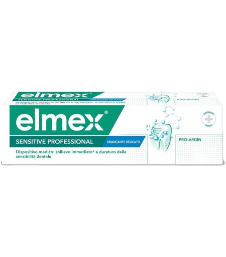 elmex SENSITIVE PROFESSIONAL WHITENING Descrizione Dentifricio per un sollievo immediato dal dolore dei denti sensibili. Elmex Sensitive Professional Whitening occlude i canali collegati alle terminazioni nervose del dente, bloccando il dolore. Con l'uso regolare, forma una barriera protettiva di lunga durata che agisce da sigillante contro la sensibilità. La sua formula a bassa abrasività rimuove delicatamente ed efficacemente le macchie, aiutando a ripristinare il bianco naturale dei denti.Con esclusiva formula Pro-Argin: l'efficace tecnologia che i dentisti utilizzano con i loro pazienti per dare sollievo alla sensibilità dentale. Ingredienti Calcium carbonate, aqua, sorbitol, bicarbonate, sodium lauryl sulfate, sodium monofluorophosphate (1.450 ppm F-), aroma, cellulose gum, sodium bicarbonate, tetrasodium pyrophosphate, titanium dioxide, benzyl alcohol, sodium saccharin, canthan gum, limonene, arginine (8%). Modalità d'uso Per un sollievo immediati: dal dolore applicare fino a due volte al giorno direttamente con la punta del dito sul dente sensibile e massaggiare delicatamente per un minuto. -Bambini fino a 12 anni: applicare con la punta del dito per un sollievo immediato. Per un sollievo prolungato: applicare il prodotto su uno spazzolino da denti, facendo attenzione a spazzolare tutte le aree sensibili dei denti. Spazzolare due volte al giorno. -Bambini fino ai 6 anni: utilizzare una piccola quantità di dentifricio sotto la supervisione di un adulto per ridurre al minimo l'ingerimento. Avvertenze Tenere fuori dalla portata dei bambini al di sotto dei 3 anni di età. In caso di assunzione di fluoruro da altre fonti, consultare il dentista o il medico. Conservazione Validità a confezione integra: 36 mesi. Formato Tubetto da 75 ml. ...