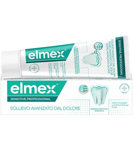 elmex SENSITIVE PROFESSIONAL Descrizione Dentifricio per un sollievo immediato dal dolore dei denti sensibili, clinicamente provato. Con esclusiva formula Pro-Argin: l'efficace tecnologia che i dentisti utilizzano con i loro pazienti per dare sollievo alla sensibilità dentale.Elmex Sensitive Professional occlude i canali collegati alle terminazioni nervose del dente, bloccando il dolore. Con l'uso regolare, forma una barriera protettiva che agisce da sigillante contro la sensibilità. Ingredienti Calcium carbonate, aqua, sorbitol, bicarbonate, sodium lauryl sulfate, sodium monofluorophosphate (1.450 ppm F-), aroma, cellulose gum, sodium bicarbonate, tetrasodium pyrophosphate, titanium dioxide, benzyl alcohol, sodium saccharin, canthan gum, limonene, arginine (8%). Modalità d'uso Per un sollievo immediato: dal dolore applicare fino a due volte al giorno direttamente con la punta del dito sul dente sensibile e massaggiare delicatamente per un minuto. -Bambini fino a 12 anni: applicare con la punta del dito per un sollievo immediato. Per un sollievo prolungato: applicare il prodotto su uno spazzolino da denti, facendo attenzione a spazzolare tutte le aree sensibili dei denti. Spazzolare due volte al giorno. -Bambini fino ai 6 anni: utilizzare una piccola quantità di dentifricio sotto la supervisione di un adulto per ridurre al minimo l'ingerimento. Avvertenze Tenere fuori dalla portata dei bambini al di sotto dei 3 anni di età. In caso di assunzione di fluoruro da altre fonti, consultare il dentista o il medico. Conservazione Validità a confezione integra: 36 mesi. Formato Tubetto da 75 ml. ...
