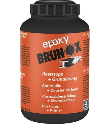 Rivestimento e primer brevettato antiruggine con resine epossidiche · penetra circa 10 volte più in profondità nei pori della ruggine rispetto alle emulsioni converti-ruggine tradizionali · ottima scorrevolezza, non lascia tracce di pennello · compatibile con la maggior parte dei sistemi di finitura comunemente disponibili · applicabile anche non diluito con pistole airless o a spruzzo ad aria compressa · privo di metalli pesanti e acidi minerali · non è necessario utilizzare sgrassanti per silicone, pulitori per freni o simili Restauro della ruggine in 3 fasi: 1. rimuovere la ruggine allentata, spolverare o soffiare via polvere di ruggine/particelle di ruggine con un panno umido o un compressore · 2. applicare 2 strati di BRUNOX® epoxy® oppure 3-4 strati con pistola airless o spruzzo · verificare che siano completamente asciutti (durezza sotto un’unghia) – non è necessario risciacquare · 3. carteggiare leggermente lo strato (solo per rimuovere la lucentezza) · applicare stuccature, ...