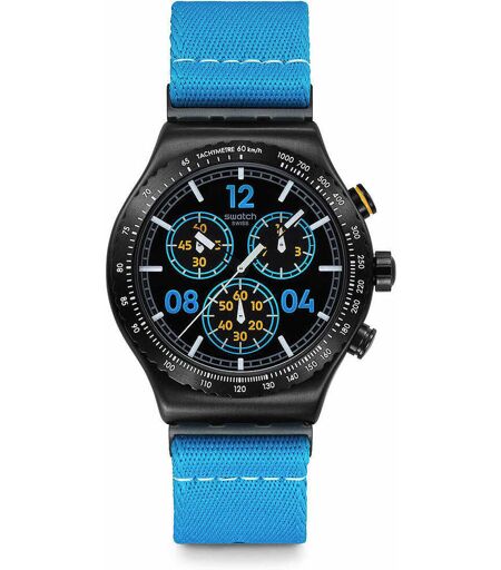 Orologio Moments In Blue Unisex Di Swatch Della Collezione Essentials. Orologio Cronometro Con Cassa Rotonda In Acciaio Inox Spazzolato Nero Pvd, Diametro Cassa 43mm. Orologio Con Indicazione Analogica Con Indici, Quadrante Con Finitura Opaca E Cinturino ...