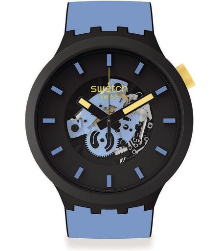 Orologio Solo Tempo Unisex Di Swatch Della Collezione Monthly Drop. Orologio Con Cassa In Materiale Bioceramico Di Colore Nero E Di Forma Rotonda. Il Diametro Della Cassa È 47 Mm. Orologio Con Cinturino In Silicone Di Colore Nero Con Stampa Blu. La ...