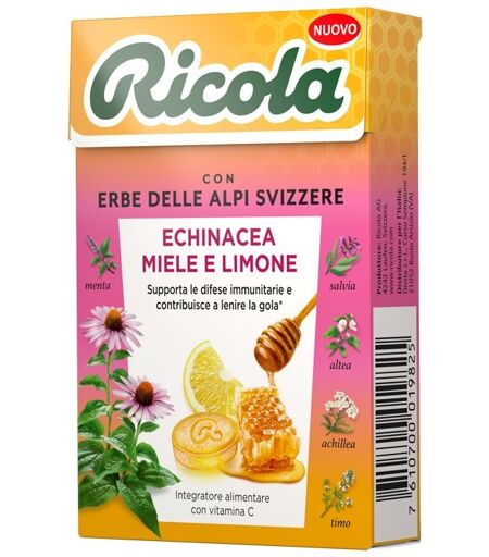 Ricola - ECHINACEA MIELE E LIMONE - CON ERBE DELLE ALPI SVIZZERE - Descrizione Integratore alimentare con vitamina C. La vitamina C contribuisce al normale funzionamento del sistema immunitario. Il mentolo contribuisce a lenire la gola. Contiene la tradizionale miscela di 13 erbe Ricola, miele, lim… ...