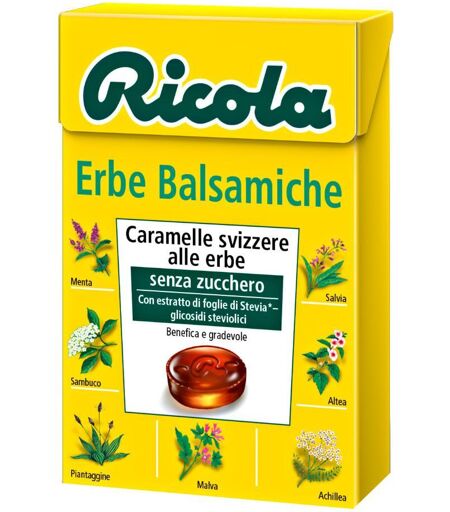 Ricola Erbe Balsamiche Caramelle svizzere alle erbe senza zucchero Con estratto di foglie di Stevia glicosidi steviolici Benefica e gradevole Non contiene glutine. Ingredienti Isomalto; estratto (1%) della miscela di erbe Ricola (piantaggine, altea, menta, timo, salvia, alchemilla, sambuco, primula… ...