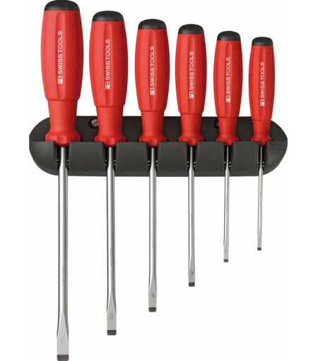 Set cacciavite per viti a fessura N. PB 8240 • Acciaio per molle altolegato • Lama rotonda • Punta piano-parallela • Maniglia a 2 componenti SwissGrip con protezione roll-off • Goffratura testa con simbolo di uscita e dimensioni Consegna: Con staffa a parete. Contenuto: 6 cacciaviti per viti a fessura 35; 4; 55; 65; 8; 10 millimetri ...