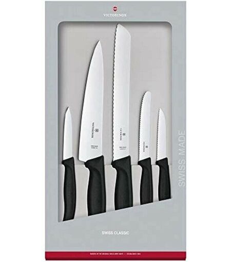 Victorinox Set di 5 Coltelli da Cucina - 6.7133.5G Il set è composto da: coltello per verdure con lama seghettata coltello per verdure mediamente appuntito coltello da pomodori e da tavola con lama seghettata coltello per sfilettare , coltello da pane ...