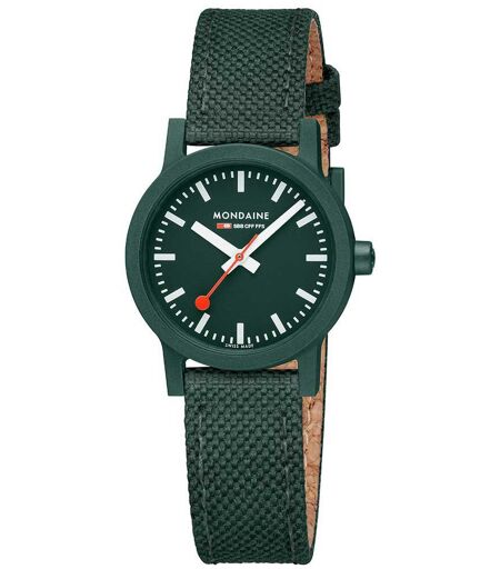 Essenza 32 mm.Caso: Materia prima rinnovabile verde parco.Colore quadrante: verde parco.Cinturino/braccialetto: tessuto riciclato verde parco con cuciture e fodera in sughero. ...