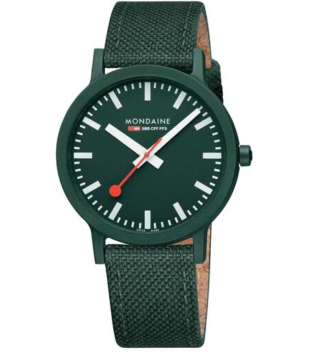 Essenza 41 mm.Caso: Materia prima rinnovabile verde parco.Colore quadrante: verde parco.Cinturino/braccialetto: tessuto riciclato verde parco con cuciture e fodera in sughero. ...