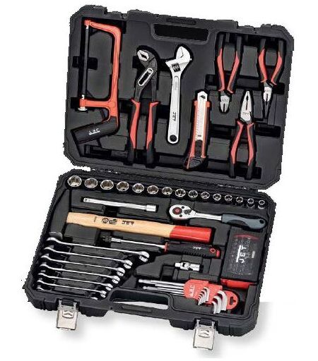 Jet - Cassetta degli attrezzi 75 pezzi - X_573B Cassetta degli attrezzi con utensili di qualità accuratamente selezionati. Questa scatola contiene: - Cricchetto 48 denti 3/8 " - Estensione 3/8 " - Boccola 3/8" 8 a 22mm - Ghiera 8-10-11-12-13-14-17mm - Martello, cutter, pinze universali, chiavi, taglierini Dati tecnici: Altezza totale 100mm Profondità 240mm Larghezza 350mm Peso 5,5 kg ...