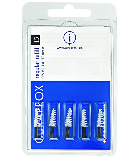 CURAPROX - regular 15 plus - Descrizione Lo spazzolino regular viene consigliato per la prevenzione secondaria negli spazi interdentali aperti: per otturazioni, corone, ponti e placca particolarmente ostinata. Composizione Setole: nylon. Manico: polypropylene. Parte interna: stainless stell, nickel… ...