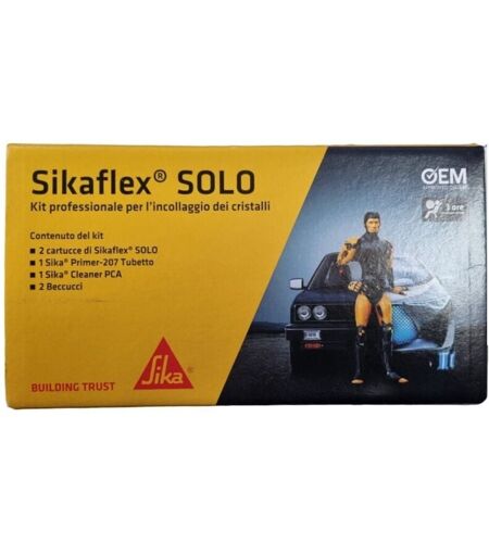 KIT PROFESSIONALE PER L'INCOLLAGGIO DEI CRISTALLI CONTENUTO DEL KIT: 2 cartucce di Sikaflex SOLO 1 Sika Primer-207 Tubetto 1 Sika Cleaner PCA 2 Beccucci Sikaflex® SOLO Adesivo poliuretanico primerless per vetri auto Sikaflex® SOLO è un adesivo per parabrezza in vetro senza necessità di primer e senza solventi che offre 3 ore di Minimum Drive-Away Time (MDAT). Fornisce un lungo tempo aperto e garantisce un'applicazione sicura anche in ambienti caldi. Le installazioni eseguite con Sikaflex® SOLO non lasciano odori sgradevoli nell'auto dopo aver sostituito il parabrezza. Nota: l'applicazione senza primer sul vetro richiede la preparazione del vetro utilizzando un detergente per vetri di grado automobilistico come Sika® Cleaner G+P. Le superfici di incollaggio devono essere prive di contaminazioni e avere un'adeguata protezione dai raggi UV. Adesione al vetro senza primer 3 ore Minimum Drive-Away Time Facile da estrudere con pistola manuale ...