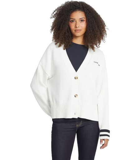 Cardigan d´ispirazione vintage con logo GUESS JEANS ricamato.Realizzato con 100% cotone organico.Cardigan in filato.Scollo a V.- Logo ricamato sul petto.- Maniche lunghe con polsini a righe in stile college.- Vestibilità ampia e lunghezza cropped.- Chiusura frontale con bottoni.ESTERNO (tessuto principale): 100% Cotone.ETICHETTA DI LAVAGGIO:Lavare a mano in acqua fredda.100% Cotone organico.Composizione:100% Cotone. ...