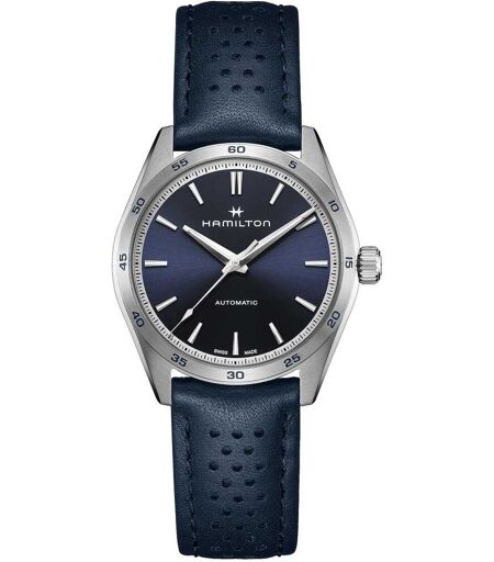 Orologio Da Uomo Di Hamilton, Della Collezione Jazzmaster, Con Movimento Automatico. Ha Una Cassa In Acciaio, Con Corona A Vite, Vetro In Zaffiro E Quadrante Di Colore Blu. Il Cinturino È In Pelle Di Colore Blu E Ha Una Resistenza Di 10 Atm. La ...