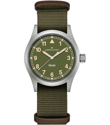 Orologio Da Uomo Di Hamilton Della Collezione Khaki Field Con Movimento Quarzo. Orologio Con Cassa In Acciaio Di Colore Argento. Il Diametro Della Cassa È Di 38 Mm E La Resistenza All'Acqua È 5/(50). Il Quadrante È Di Colore Verde E Il Cinturino È In ...