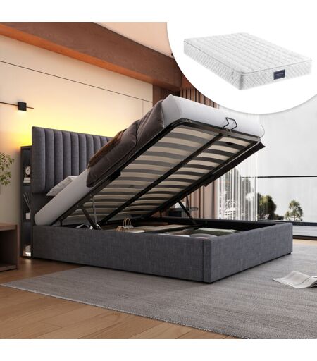 HOMMOO Letto contenitore Letto matrimoniale imbottito 160 x 200 cm con rete a doghe in legno, led con ricarica usb Type c, grigio, materasso incluso