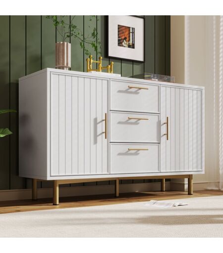 【Stile lussuoso e moderno】La forma semplice ma elegante con nervature decorative sui frontali è un must per gli amanti del design moderno. La base in metallo conferisce leggerezza al design e il tutto è completato da maniglie decorative in oro. Con il suo design simmetrico e scanalato e le linee morbide, questa cassettiera sarà un vero e proprio elemento di spicco nella tua casa. 【Ripiano regolabile in altezza】con i suoi 3 spaziosi cassetti al centro del lato. A sinistra e a destra si trova un'anta incernierata, dietro la quale si trova un ripiano regolabile in altezza che divide lo spazio disponibile in due scomparti variabili e offre ampio spazio per riporre biancheria, gioielli e altri utensili. Regolabile su e giù con incrementi di 5 cm, 3 altezze in totale. 【Regola l'altezza dei tuoi mobili】La gamba centrale regolabile può aiutarti a regolare il livello della tua cassettiera, non causerà danni o graffi ai tuoi pavimenti, manterrà i piedi del prodotto lontani dal pavimento ...