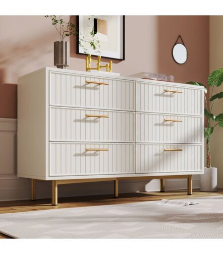 【Stile lussuoso e moderno】La forma semplice ma elegante con nervature decorative sui frontali è un must per gli amanti del design moderno. La base in metallo conferisce leggerezza al design e il tutto è completato da maniglie decorative in oro. Con il suo design simmetrico e scanalato e le linee morbide, questa cassettiera sarà un vero e proprio elemento di spicco nella tua casa. 【Cassetti portaoggetti di uguali dimensioni】È possibile sistemare vestiti e altri oggetti nei sei cassetti funzionali con un volume interno di 10H/33,5L/52P cm. Anche l'interno dei cassetti è rifinito in bianco crema, un pezzo che dimostra l'attenzione ai dettagli sia all'interno che all'esterno. I cassetti di dimensioni generose offrono tutto lo spazio necessario per riporre ordinatamente i tuoi effetti personali, fuori dalla vista ma a portata di mano! 【Regola l'altezza dei tuoi mobili】La gamba centrale regolabile può aiutarti a regolare il livello della tua cassettiera, non causerà danni o graffi ai tuoi ...