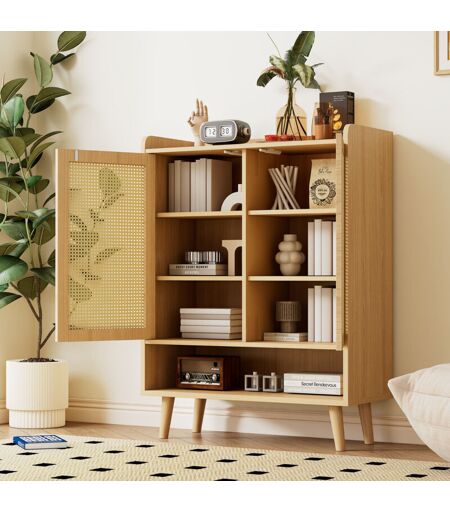 HOMMOO - Scarpiera in rattan con 2 ante e 5 ripiani, con maniglie in legno e gambe in legno massello, rovere chiaro