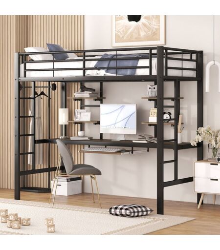 MODFU Letti a soppalco 90x200cm, con scrivania e 2 ripiani, letti singoli per adulti/bambini, metallo, senza materasso, nero