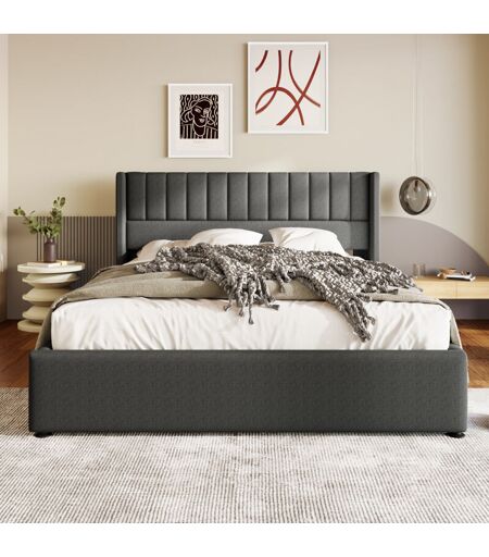 REDOM Letto imbottito con contenitore, letto idraulico (lino grigio 140x200cm senza materasso), letto con rete a doghe in struttura metallica