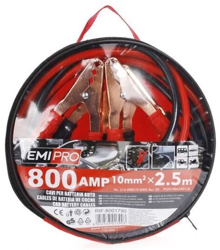 Kit Cavi Per Avviamento Batteria Auto 800 AMP, Sezione Cavo 10mmq, Lunghezza Da 2.5 Metri,Peso 1110g. Modello Di Base,Adatto Per Auto e Veicoli Di Piccole e Medie Dimensioni Fino A 2000cc Colorazione Classica Nera e Rossa Per Facile Corrispondenza Ai Poli. Sarai Sempre Pronto A Ridare Spunto Ad Un'Auto In Panne. Materiale Di Rame, Guaina Plastica PVC,Pinze In Metallo Con Impugnatura In PVC ...