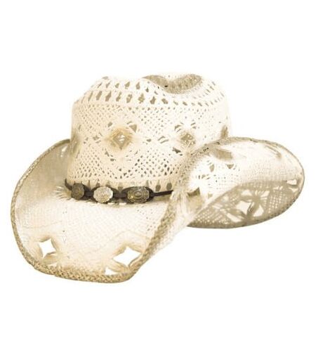 Cappello western da donna in paglia bicolore. Lacciolino in cuoio con lavorazioni e laccetto sottogola regolabile. ...