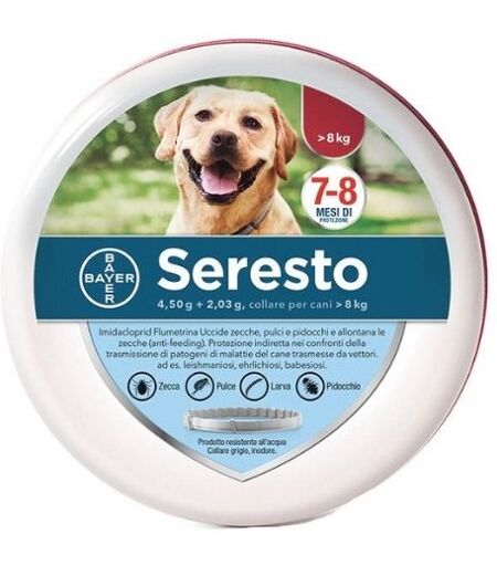 Protezione Pulci, Zecche, Leishmaniosi - DESCRIZIONE PRODOTTO: - Seresto è un collare antiparassitario di alta efficacia della Bayer, indicato per la prevenzione e il trattamento delle infestazioni da pulci, zecche, pidocchi e flebotomi. Grazie alla sua doppia azione insetticida e repellente, prote… ...