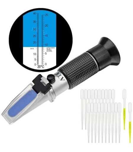 Grâce à ce réfractomètre, vous pouvez facilement vérifier la qualité des raisins et ainsi mieux brasser votre vin ! Le réfractomètre est principalement développé pour tester la teneur en sucre du jus de raisin original, puis pour déterminer la teneur potentielle en alcool du vin de raisin, le jus de raisin fermenté. Il ne peut pas être utilisé pour mesurer le taux d'alcool du vin. . Plage de mesure : Brix (mas sacch) : 0-40%, alcool : 0-25, Résolution : Brix (mas sacch) : 0.2%, alcool : 0.2% . Facile à utiliser. Placez-les 2, 3 gouttes d'échantillon sur le prisme principal, fermez la plaque et regarder par la fenêtre à la lecture Brix; CALIBRATION: calibrage du zéro avec de l'eau à 20 ° C, la compensation automatique de la température entre 10 ° C et 30 ° C (ATC) . La mesure de précision Sharp ligne de division (bleu-blanc), facile à lire (lumière du jour visible), oculaire réglable pour le réglage de mise au point . Étalonnage : étalonnage du zéro avec l'eau distillée à 20 °C, ...