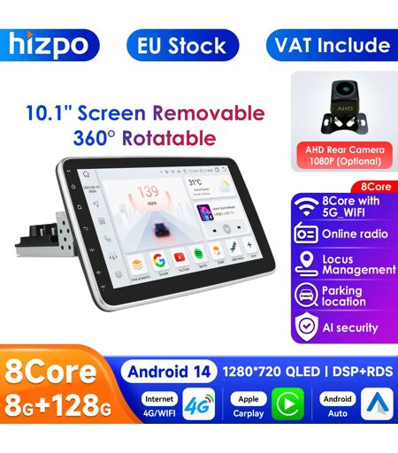 HIZPO 8 + 128G 10.1 ''360 Girevole 1 Din AutoRadio GPS per Auto Universale Lettore Multimediale Stereo 1DIN Video Autoradio Carplay HeadUnit