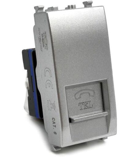 Una presa telefonica è un dispositivo, inserito a muro, che consente il collegamento di un apparecchio telefonico di telefonia fissa alla rete telefonica. Oggi conosciuta con il nome di connettore telefonico RJ11, connessione a morsetti che serve per realizzare una presa murale alla quale collegare l'apparecchio e quindi destinato ai servizi telefonici e di trasmissione dati. Presa telefonica a muro completa di targhetta identificativa e portello antipolvere. Colore: Silver Tipologia: RJ11 Compatibile: Vimar Plana Dimensioni: H 4.5 x P 3.5 x L 2 cm ...