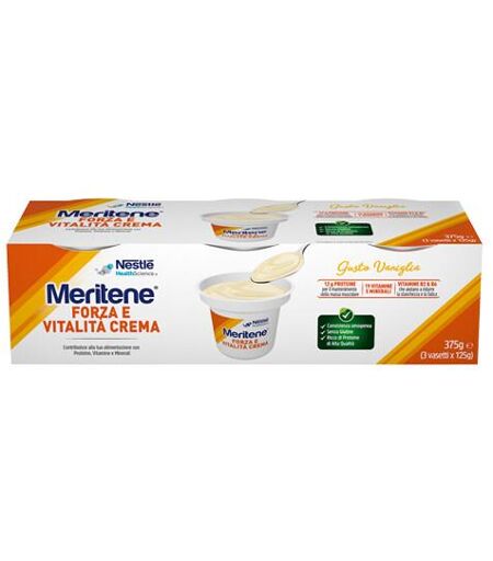 Crema dessert alla vaniglia dall'elevato valore nutrizionale, è particolarmente indicata per gli anziani con difficoltà di masticazione e deglutizione.Meritene Crema Vaniglia Dessert è un dessert a consistenza cremosa, ad alto contenuto di proteine e ad alto valore nutrizionale. Ha una consistenza morbida ed omogenea, facile da masticare e deglutire, è pronto all'uso e non contiene glutine.Consigli d'usoDa 1 a 3 vasetti al giorno.IngredientiAcqua, proteine del latte (contengono lecitine di soia), maltodestrine,zucchero, olio di colza, amido modificato, sali minerali (citrato di sodio, cloruro dimagnesio, fosfato di potassio, citrato di potassio, ossido di magnesio, solfato di ferro,solfato di zinco, selenito di sodio, solfato di manganese, solfato di rame, cloruro dicromo, molibdato di sodio, ioduro di potassio), aromi, emulsionante (E471), gelificante(E 406), stabilizzanti (carragenina, E412), vitamine (C, niacina, E, acido pantotenico,B6, B1, B2, A, acido folico, biotina, K, D, B12), correttore di acidità (E525),colorante (caroteni).Confezione3 vasetti da 125 g cadauno al gusto vanigliaMaggiori informazioni sul prodotto le puoi trovare sul sito del produttore Nestlé Meritene Crema vaniglia grazie alla sua composizione aiuta a mantenere forza e vitalità tutti i giorni. E' adatto per persone disfagiche. Meritene Creme è stato sviluppato per rispondere nutrizionali ai bisogni degli adulti e anziani attivi, e formulato per apportare vitamine e minerali e proteine che contribuiscono al mantenimento della massa muscolare. Si tratta di un dessert cremoso specificamente pensato per adulti e anziani con problemi di dentatura, masticazione e/o deglutizione (disfagici). Meritene Creme alla vaniglia di Nestlé è un dessert che contribuisce al mantenimento della massa muscolare, con 19 vitamine e minerali. Per 100 gPer 125 gEnergiakJ 699 kcal167kJ 864 kcal 206Grassi di cui acidi grassi saturi7,3 g 1,0 g9,1 g 1,2 gCarboidrati (p.d.) di cui zuccheri15 g 9 g19 g 11 gFibra alimentare0,50 g0,62 gProteine10 g12 gSale0,16 g0,20 g Proteica e nutrizionale Tenere fuori portata dei bambini al di sotto dei 3 anni di età. Conservare in luogo fresco ed asciutto al riparo dalla luce, dalle fonti di calore localizzate, e dai raggi solari. Evitare il contatto con gli occhi, in caso di contatto con gli occhi si consiglia di sciacquare immediatamente e abbondantemente con acqua. La data di scadenza si riferisce al prodotto correttamente conservato, in confezione integra. Non perforare né bruciare neppure dopo l'uso.Non vaporizzare su fiamma o su corpo incandescente. ...